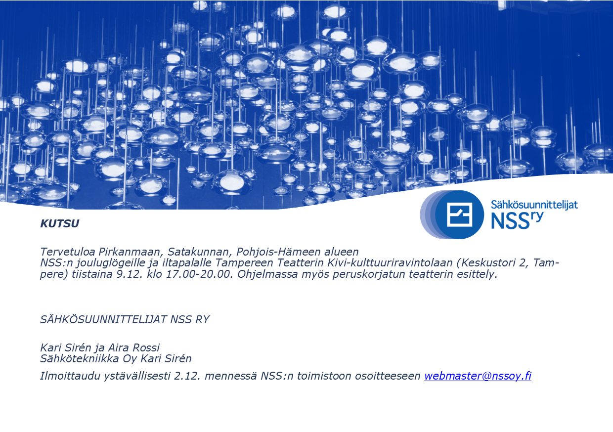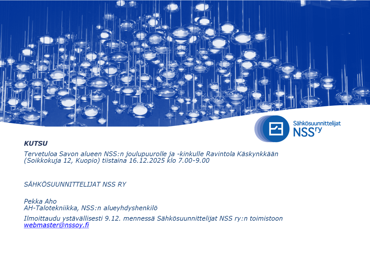 Sähkösuunnittelijat NSS ry:n, Turunmaan Sähköyhdistyksen, Varsinais-Suomen Sähkö- ja Teleurakoitsijoiden ja yhteistyökumppaneiden joulupuuro Krookilan Wanhassa Tuvassa 4.12. klo 8.00-9.30. Ilmoittautuminen 28.11. mennessä osoitteeseen webmaster@nssoy.fi.